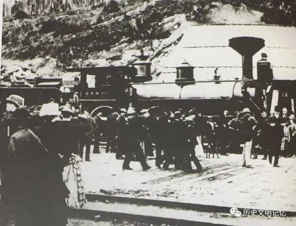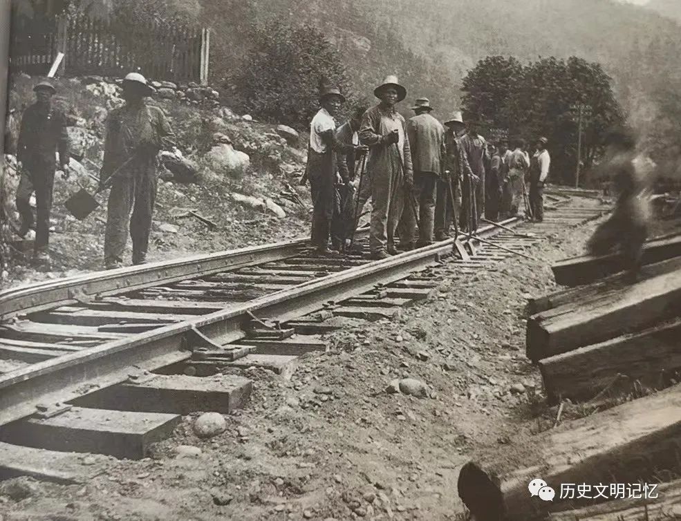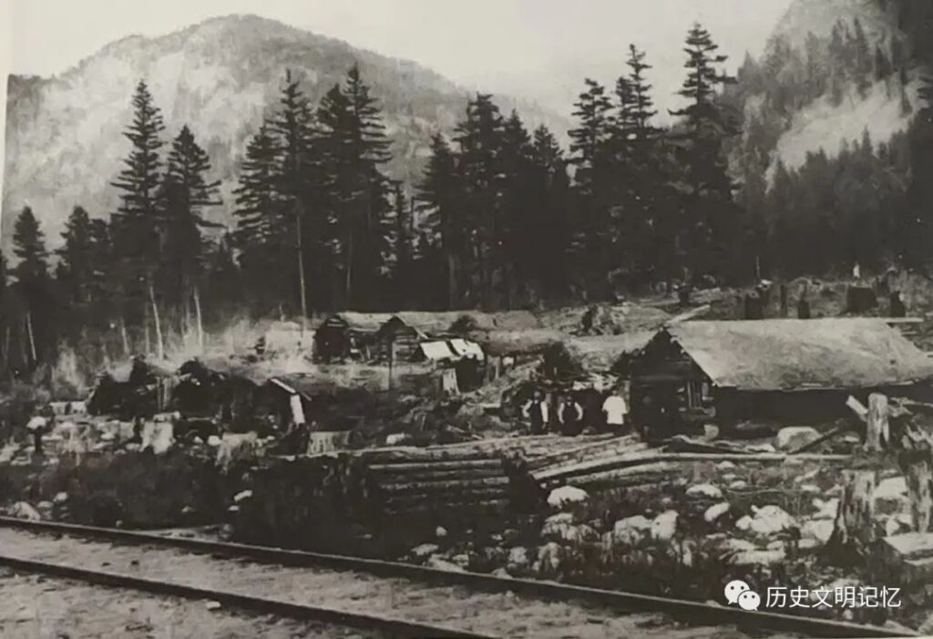 19世纪晚期,加拿大太平洋铁路公司的承包商从香港到中国广东农村,招募了1万多名劳工到加拿大太平洋铁路工作。图为1889年,中国工人在罗杰斯关口西部的铁路营房附近工作。